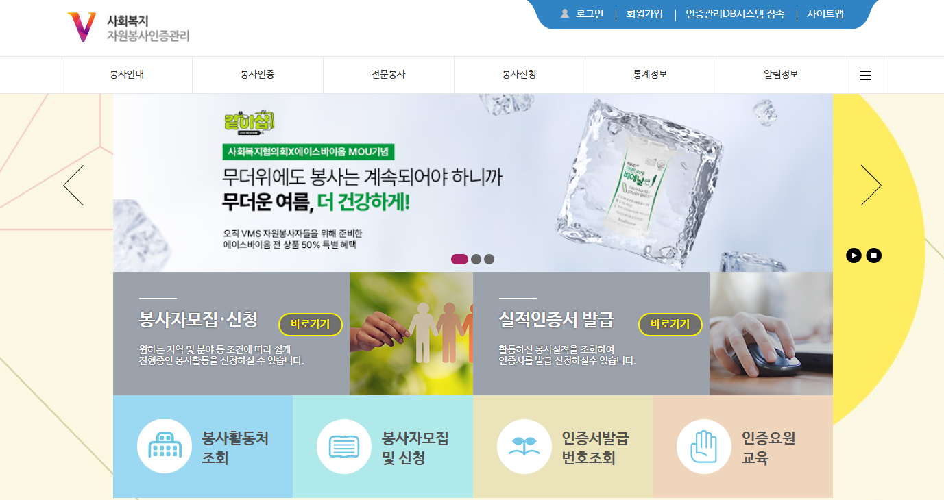 - 자원봉사자 회원가입: VMS 홈페이지에서 실명 인증 후 회원가입을 통해 봉사 신청 및 실적 등록 가능